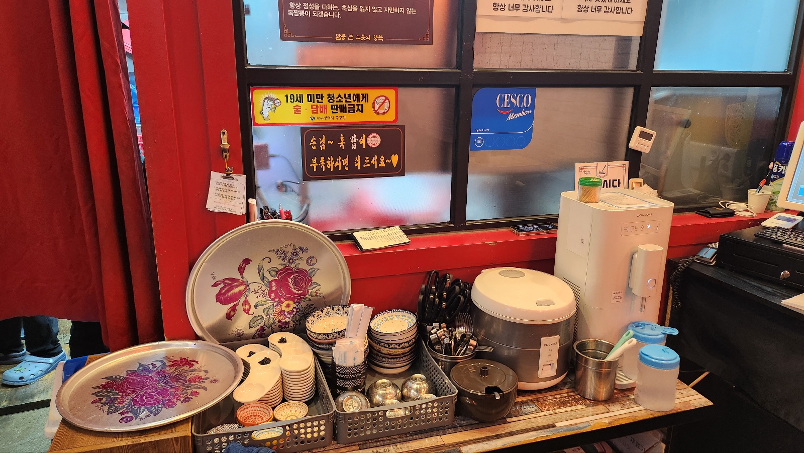 그리고 계산대 앞에 이렇게 셀프로 가져갈 수 있는 것들이 있습니다